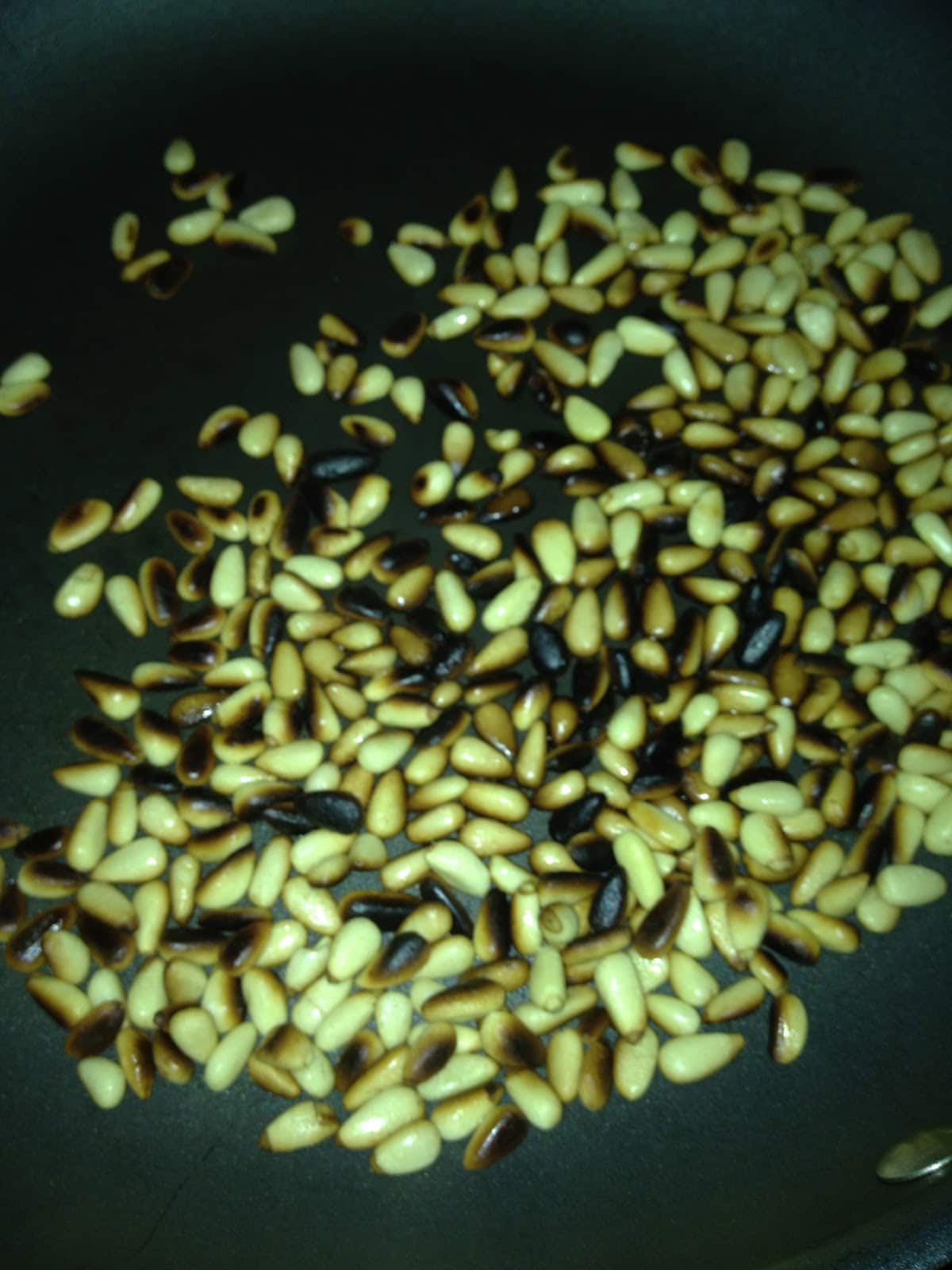 -Toast the pine nuts in a pan over medium-low heat until they are just lightly browned and fragrant (approx. 2-3 minutes).