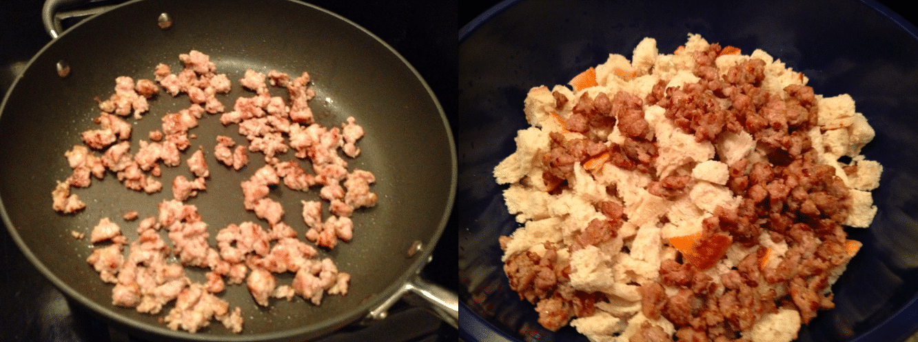 -Sauté sausage in a large pan, stirring constantly to break up the meat. Once it is cooked through (about 6 minutes), remove it from the pan and add it to the bread cubes.