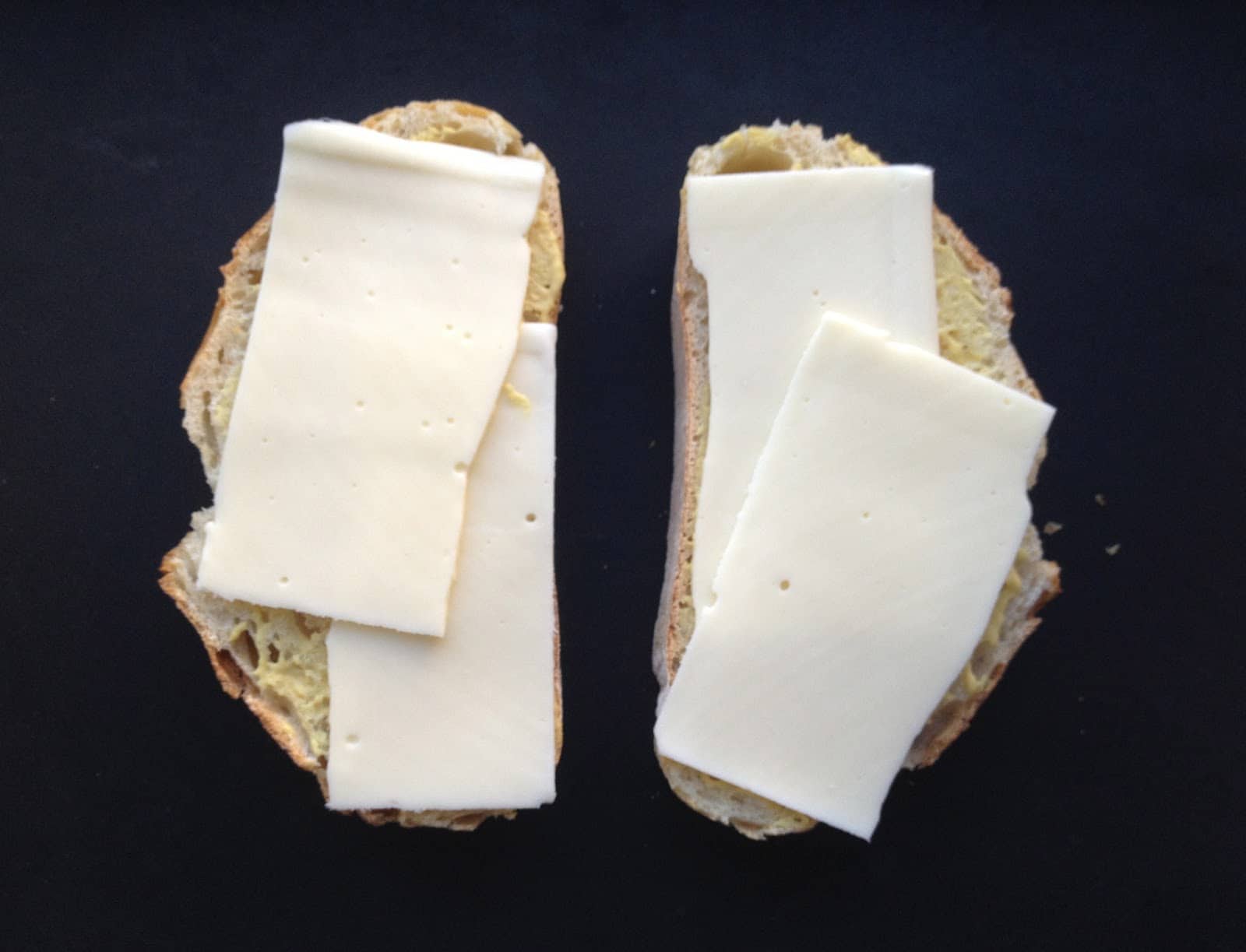 -Place 1 piece of American cheese on each slice of bread. It’s easiest to slice each piece of cheese in half and then layer the halves so they fit nicely on the bread.