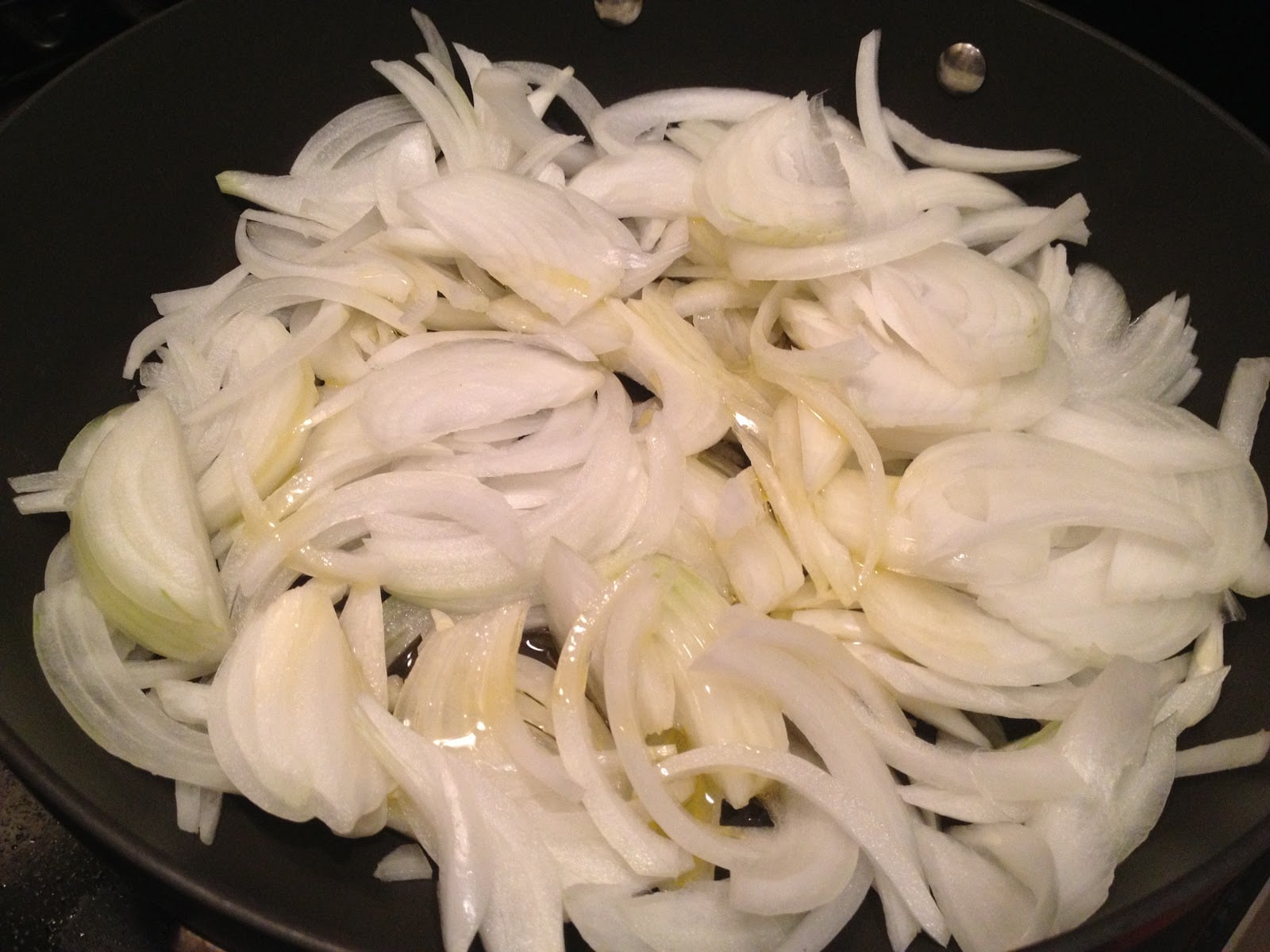 -While your meat is cooking, start caramelizing your onions. Add the thinly sliced onions, ¼ cup olive oil, sugar, and salt to a large sauté pan.