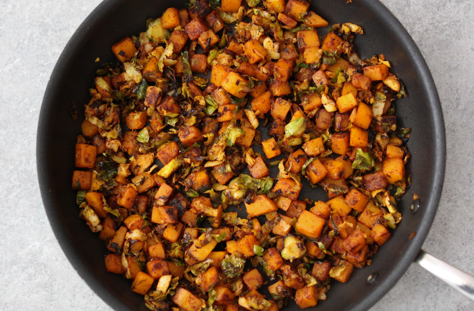 - Heat the olive oil in a large nonstick skillet over medium heat. When the oil is hot and shimmering, add the butternut squash and Brussels sprouts. Cook until very tender and lightly browned in spots, about 18-20 minutes. Stir in the paprika, chili powder, salt, and cayenne and cook for 1 minute to toast the spices. Transfer the butternut and Brussels to a bowl and briefly set aside.