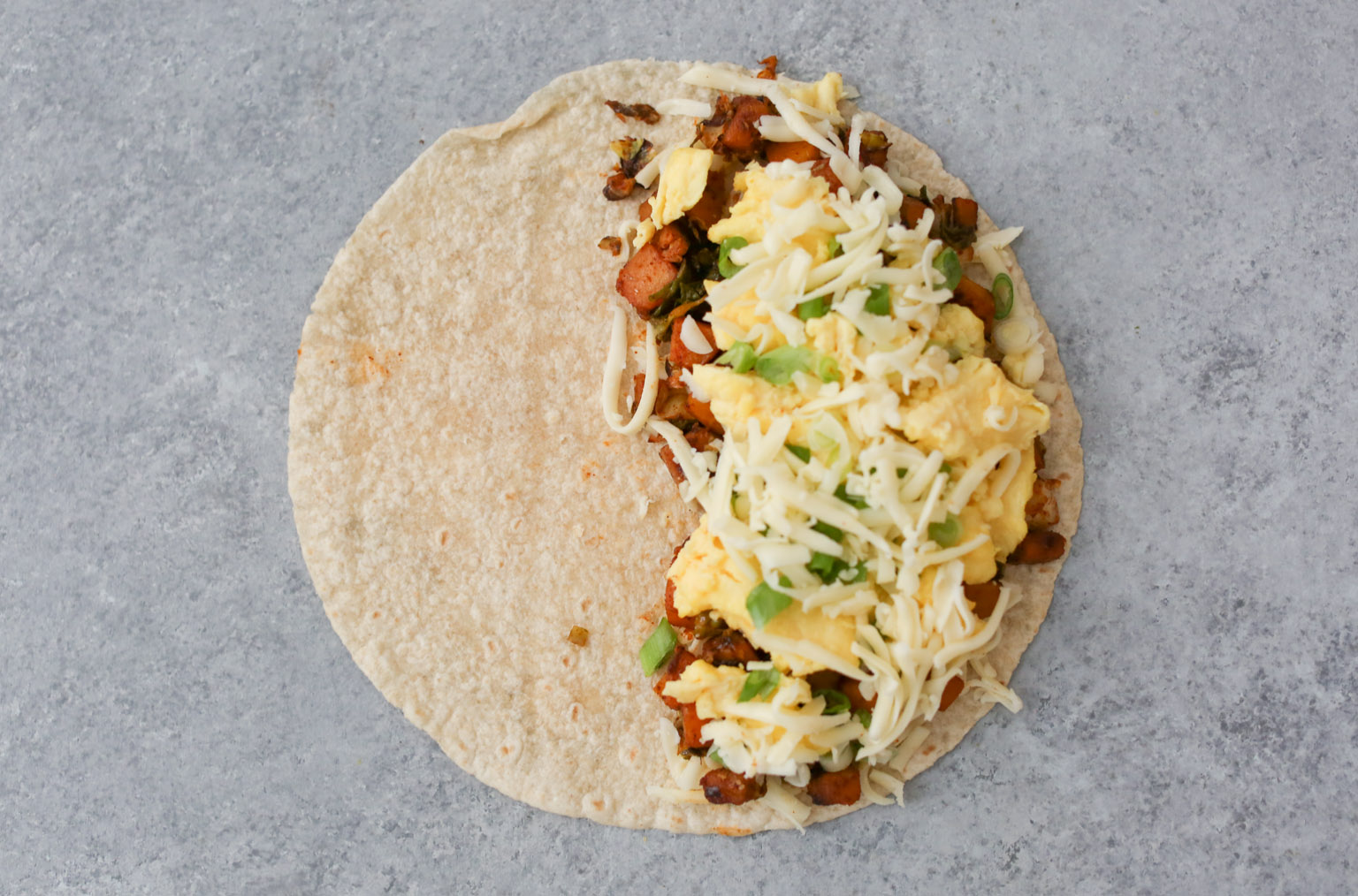 - Wipe out the skillet and return it to the stove over medium-low heat. Place a plate or bowl next to the stove. (If your pan is not truly nonstick, spray it with cooking spray or add a little olive oil or butter to the pan to prevent the eggs from sticking!!) When hot, pour in the beaten eggs. Cook, stirring in big sweeping motions with a spatula to form large curds, until the eggs are just set. (This will take a couple minutes MAX, so be sure to have that plate/bowl ready.) Transfer the eggs to the plate/bowl.-Assembly time! For each dilla: Sprinkle a ¼ cup of cheese on one half of the tortilla. Add a quarter of the butternut and Brussels mix, a quarter of the scrambled eggs, and 1 tablespoon of scallions. Sprinkle with another ¼ cup cheese and fold the empty half the tortilla over the filling to close.