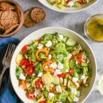- Add all the ingredients for the salad except the cheese to a mixing bowl. Toss to combine. Add half the dressing to the bowl and toss again.