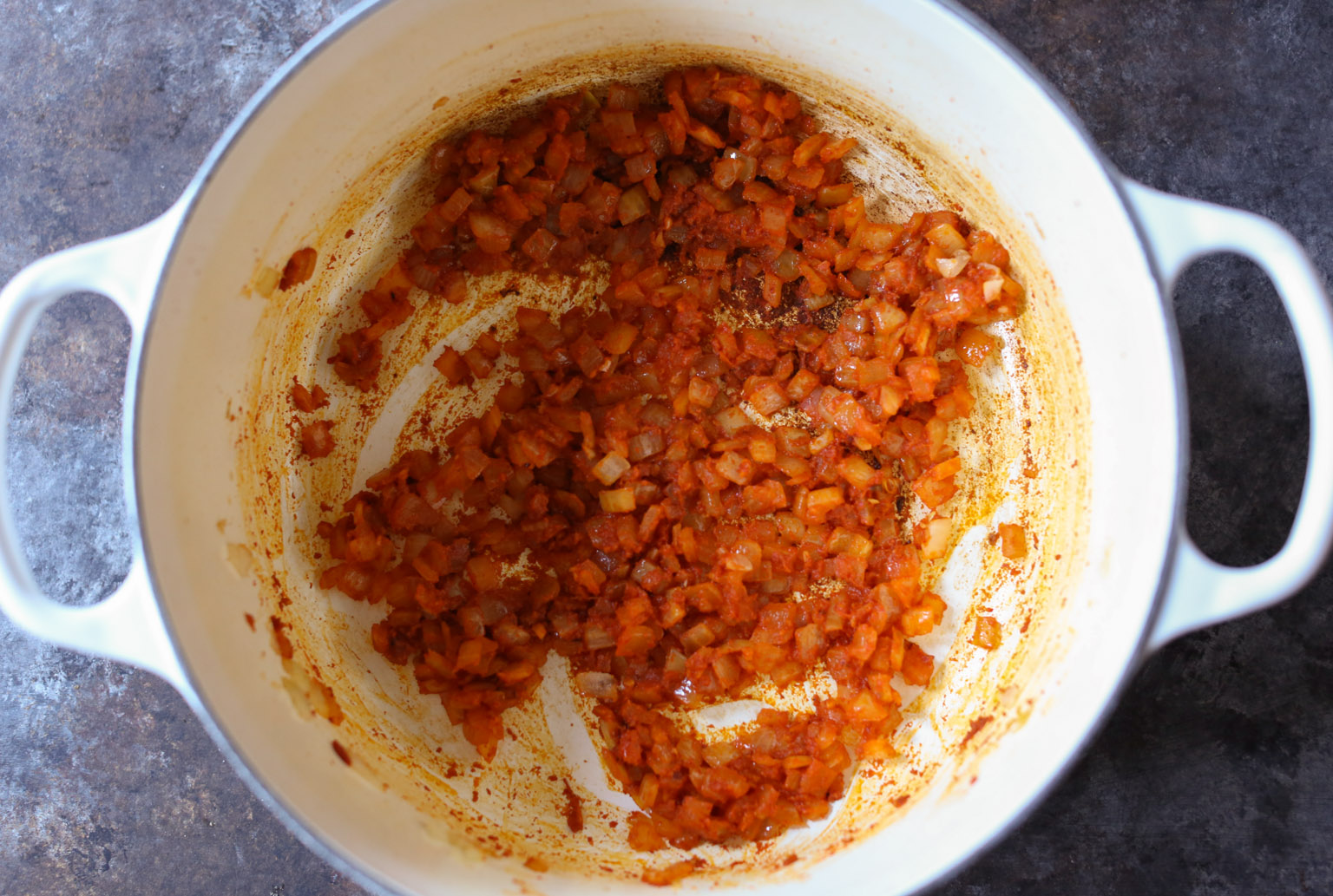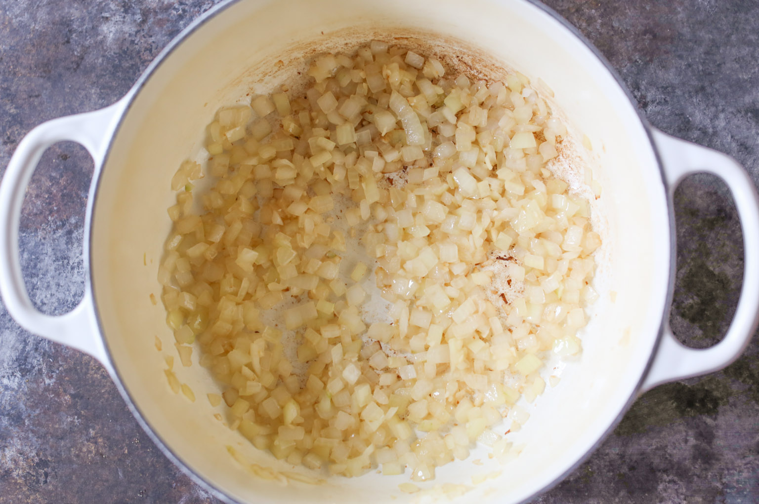 - Heat the coconut oil in a medium Dutch oven over medium heat. When the oil is hot and shimmering, add the onion and garlic and cook for about 5 minutes until the onions are translucent. (Be careful not to burn the garlic! If it starts to brown at all, reduce the heat, stat!)