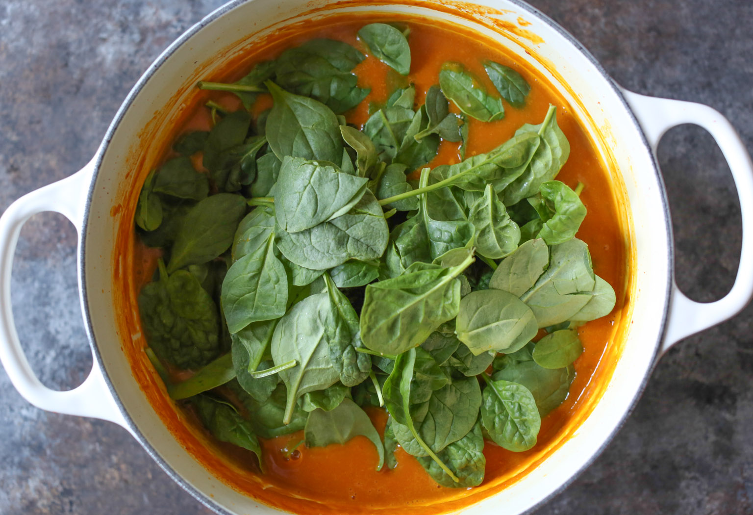 - Add the spinach, stirring until it’s just wilted, about 1 minute (max). Taste and add a little extra tamari or salt if needed. (If your stew is too thick, feel free to add a little chicken broth to achieve the desired consistency.)