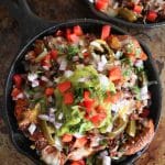- Now it’s time to assemble your nachos! You can use whatever vessel you like for your nachos. I used mini skillets because they’re cute and everyone loves a perfectly portioned meal, but you can use a large skillet or a large baking dish. Start by arranging the sweet potatoes in your vessel of choice. Next, add the beer-braised short ribs and jalapeños, and top everything with the shredded cheese. Place your nachos under the broiler for 1-2 minutes until the cheese is melted and bubbling.