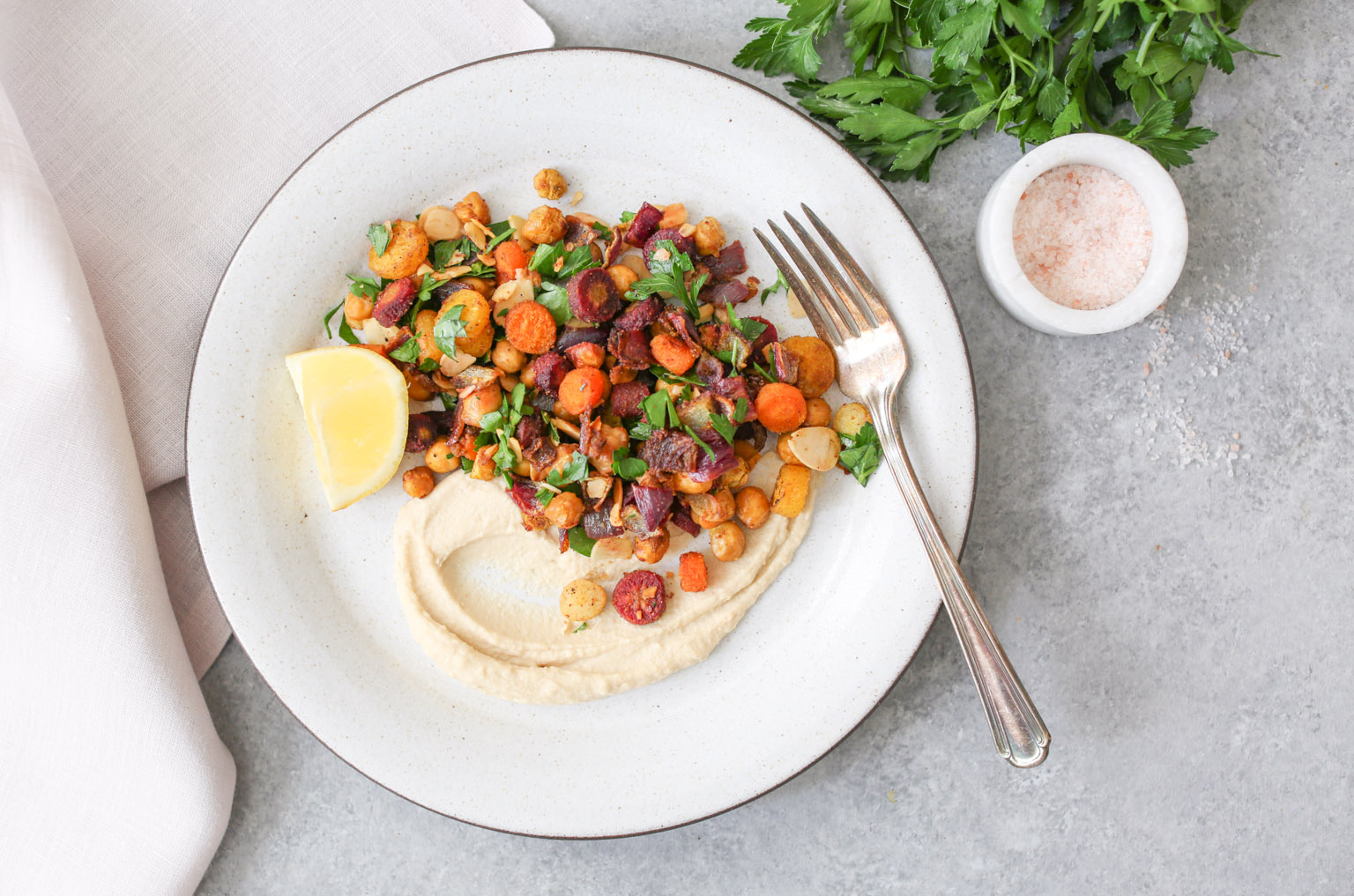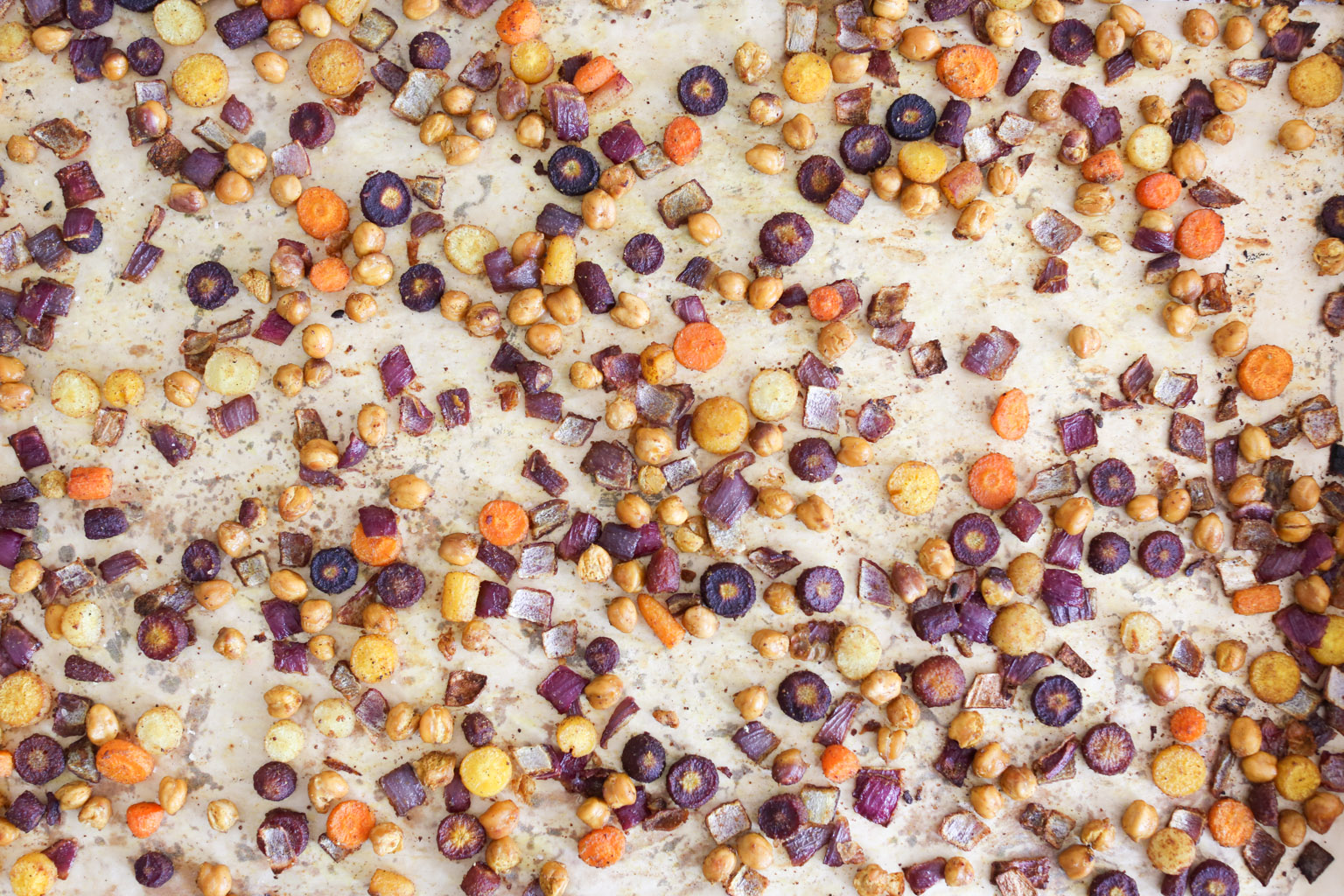 -Pre-heat the oven to 425 degrees. Line a rimmed baking sheet with parchment and set aside. Cut the carrots into ¼-inch rounds, and place them on the baking sheet along with the onion, chickpeas, and coconut oil. Toss well and add the spices, salt, and pepper.