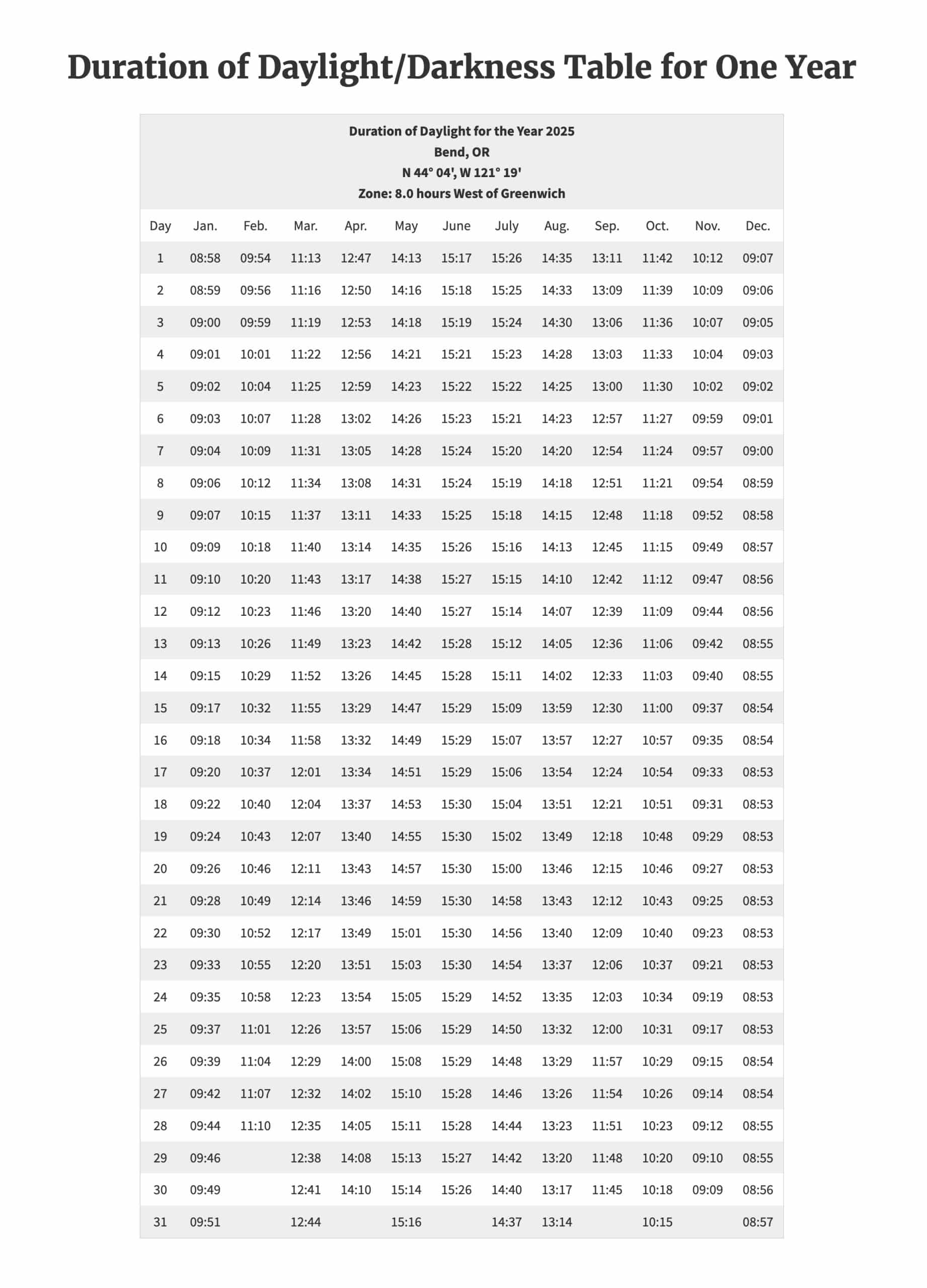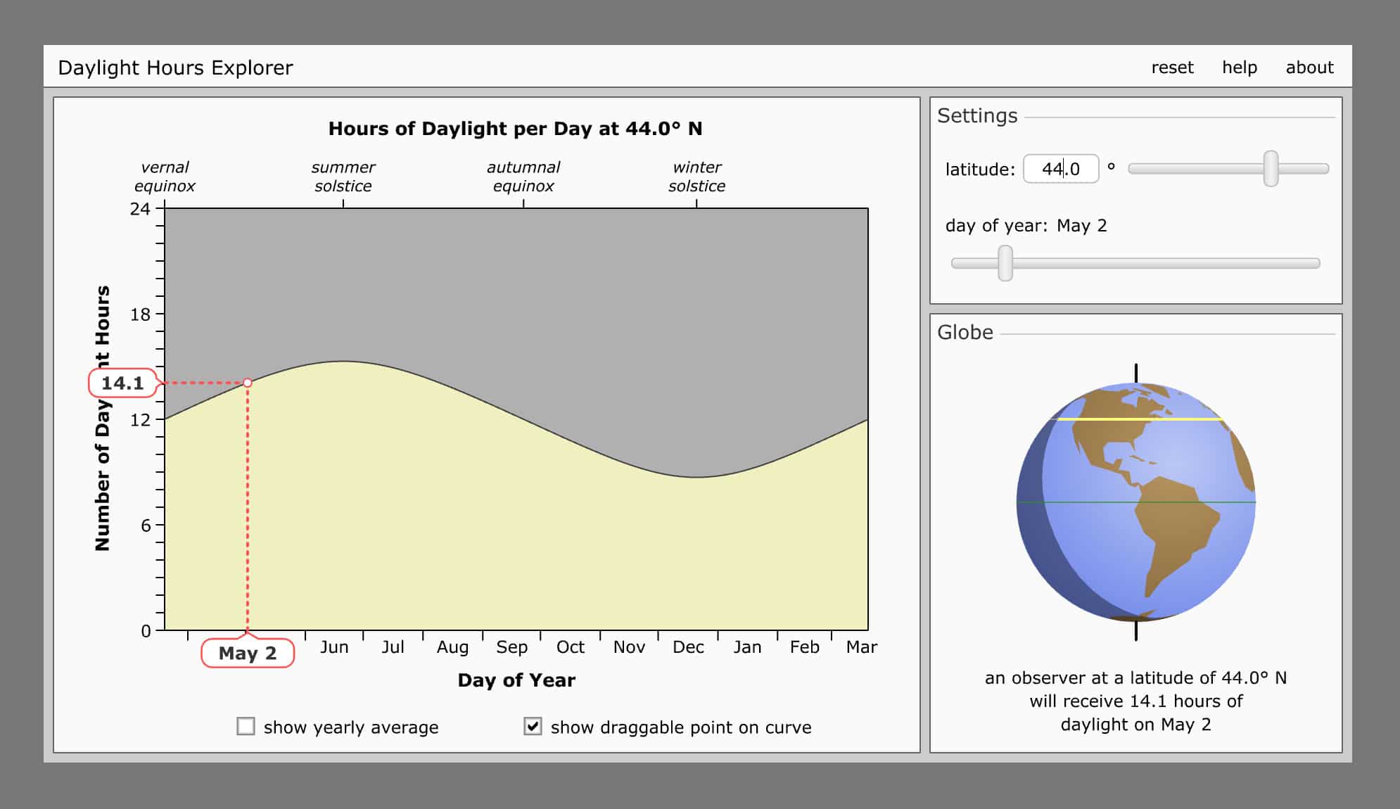 If you’re more visually inclined and know your latitude, the University of Nebraska-Lincoln has a neat little tool (example below) that lets you explore a graph of your location’s day length throughout the year.