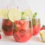 - Mojito time! Place the mint and lime juice in a glass of your choice. Muddle with a wooden spoon (or an actual cocktail muddler if you’re fancy enough to own one). Add the roasted strawberry puree and rum, and stir to combine. Add the sliced strawberries and plenty of ice. Top with club soda.