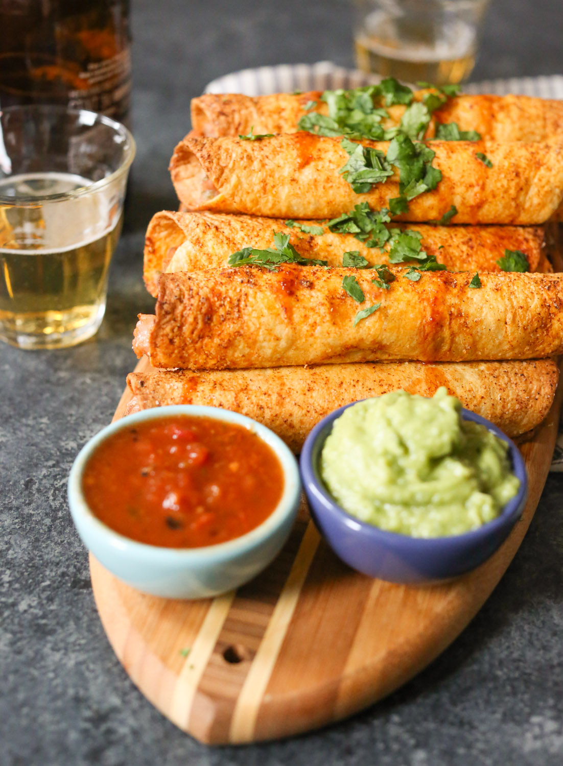 I digress. I’ve made Logan taquitos before (see page 130 of The Dude Diet), but this time around, I went with a classic bean and cheese combo. The filling is a simple yet mind-blowing mix of refried beans, Monterey Jack, salsa, pickled jalapeños, fresh cilantro, and spices, and it takes all of 5 minutes to mix up. That deliciousness gets rolled up in soft tortillas and then baked, not fried (duh), until golden brown and perfectly crispy around the edges, and BOOM. Done. Served with guac and extra salsa, they’re a healthy(ish) Game Day snack that people will freak over. The dude did.