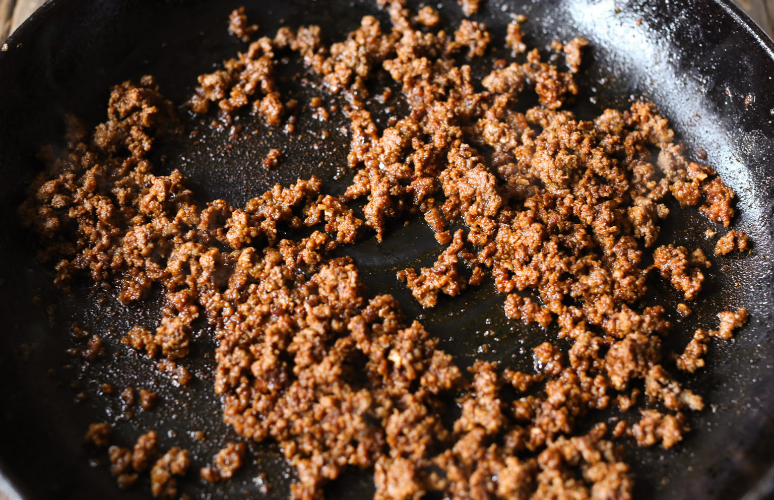 -Heat a large (12- to 14-inch) cast iron skillet over medium-high heat. When hot, add the ground beef to the pan. Cook for about 5 to 7 minutes, stirring and breaking up the meat into very small pieces with a spatula or wooden spoon, until completely browned. Add 1¾ teaspoons of the smoked paprika and the cumin to the beef. Cook for 1 minute to toast the spices.