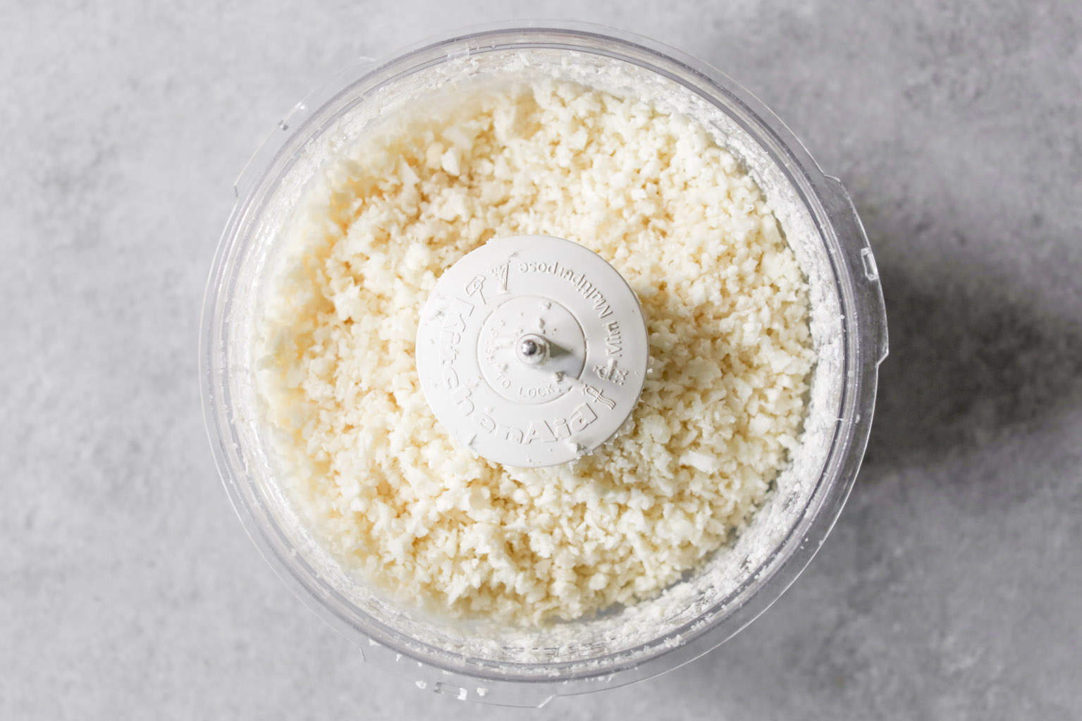 - Start by prepping the cauliflower “rice.” Add half of the cauliflower florets to the bowl of a food processor. Pulse until the florets become coarse granules that resemble rice. (Be careful not to over-process, or you’ll end up with cauliflower mush.) Transfer the cauliflower rice to a large bowl. Repeat this process until all of the cauliflower has been riced. Briefly set aside.