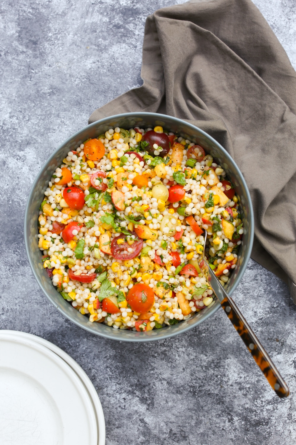 - Add the peaches, tomatoes, scallions, cilantro or basil, mint, lemon juice, and the remaining ½ tablespoon of olive oil to the cooled couscous and corn, and fold everything together with a spatula. Taste and season with a little extra salt and pepper if needed.