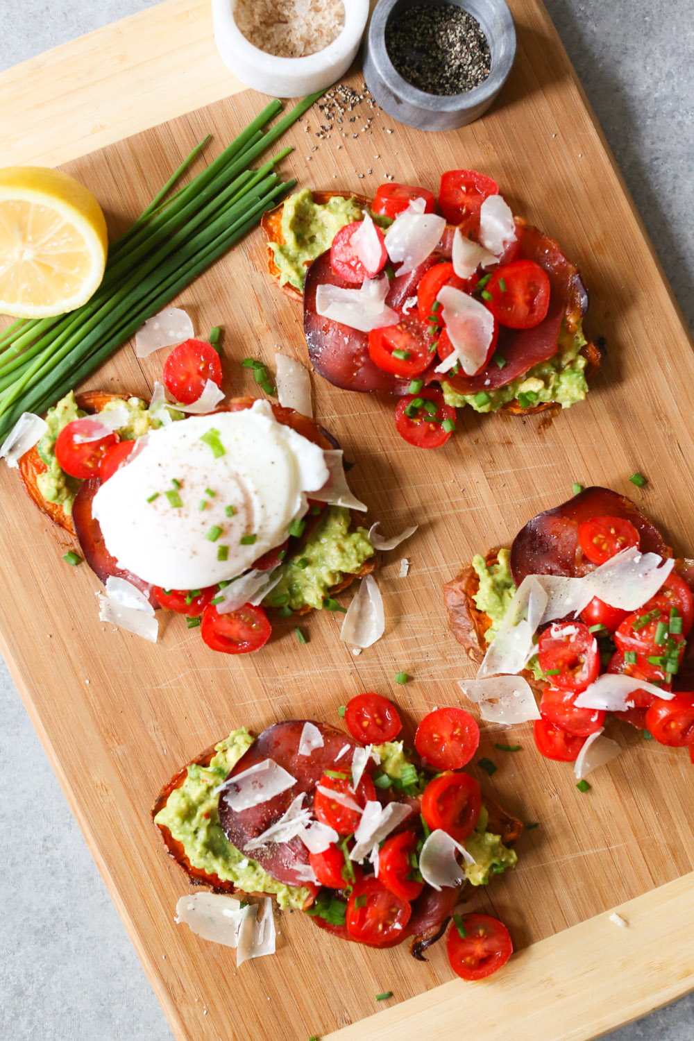 - Assembly time! Spread each sweet potato “toast” with one quarter of the avocado mash. Add a slice of crispy prosciutto and top with the cherry tomatoes, Parmesan, and chives. Serve topped with poached or fried eggs if you like.