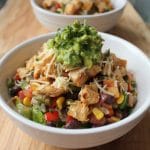Let’s take a closer look at the nutritional aspects of this Dude Diet Burrito Bowl, shall we? First, there’s the zesty cilantro-lime brown rice, which is high in fiber and will keep you full and satisfied for a longer period of time. Then you’ve got a whole lot of fresh bell peppers and red onions, along with sweet corn and black beans. Not only is this bean and vegetable medley bursting with flavor, it’s also packed with vitamins A, C, E, B6 and various antioxidants, plus a decent amount of protein and fiber. Marinated chicken breast is a delicious source of lean protein, and unlike the fat and calorie-dense marinades used by most burrito chains, this chicken is flavored with an oil-free blend of lime juice, garlic, chipotles, spices, and low-sodium chicken stock. Booyah. There is even a sprinkling of reduced-fat cheddar to address the average dude’s need for cheese and an appropriate amount of heart-healthy guacamole. You’re welcome.