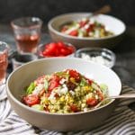 Add the cauliflower rice and cook for about 2 minutes, just until it loses some of its “bite.” Cauliflower rice cooks REALLY fast, so don’t overdo it. (It will continue cooking once it’s removed from the heat.) Fold in the pesto and bacon. Taste and season with a little salt if necessary. Depending on the acidity level of your pesto, you may want to add the balsamic vinegar. (I personally love the zip it adds.)